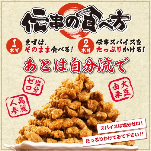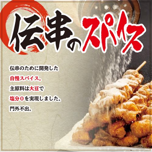 日本一のパリモチ鶏皮串に、高麗人参タレが擦り込まれた伝串。そこに、やみつき『伝串スパイス』をたっぷりかけた伝串は、旨味倍増!伝串スパイスは、各テーブルに1つございます。塩分0なので、こころゆくまでスパイスをかけてお楽しみ下さい!
